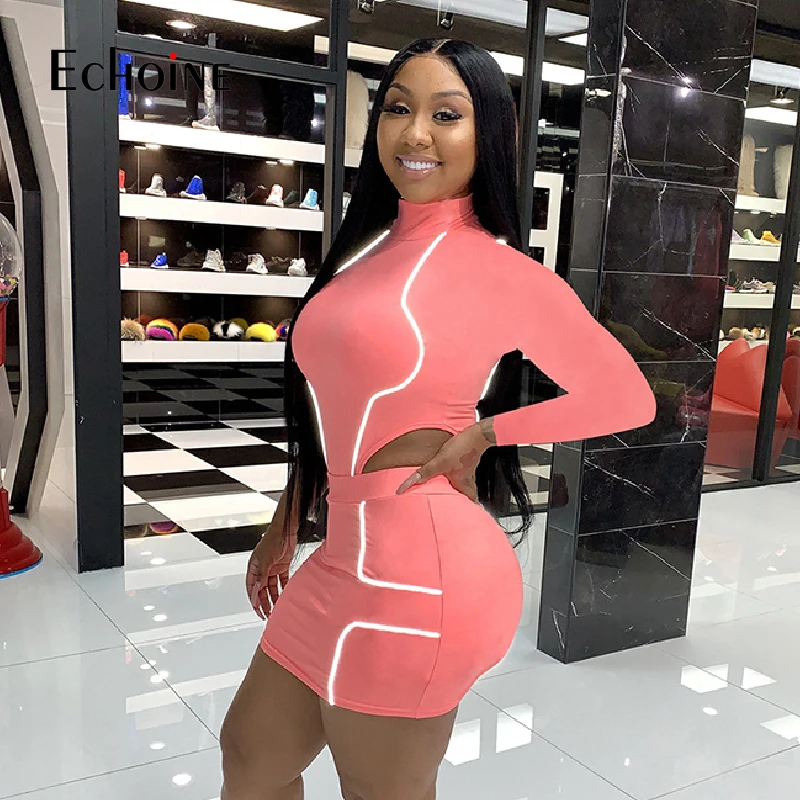 Press buy now for buy or full review Autumn Fashion Reflective Striped Women 2 Piece Set Fitness Athleisure Outfits Long Sleeve Bodysuit And Skirt Sets club outfits