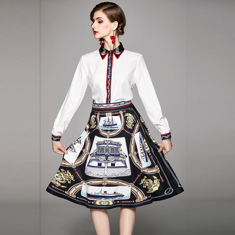 HAPPY SHOPPING European Style Autumn New Twopiece Skirt Fashion Printed Longsleeved Lapel Blouse Large Swing Skirt 2019 Loose Blouse by shopping at aliexpres with our recommendations, you will get a lot of discounts.