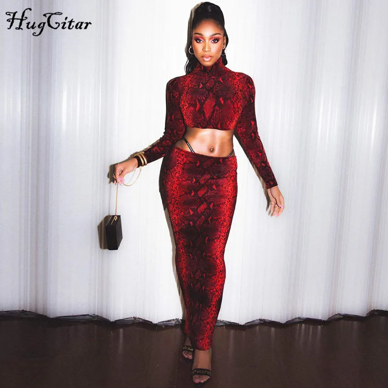 HAPPY SHOPPING Hugcitar 2019 snake print high neck long sleeve crop tops long skirt 2 pieces set autumn winter women streetwear party outfits by shopping at aliexpres with our recommendations, you will get a lot of discounts.